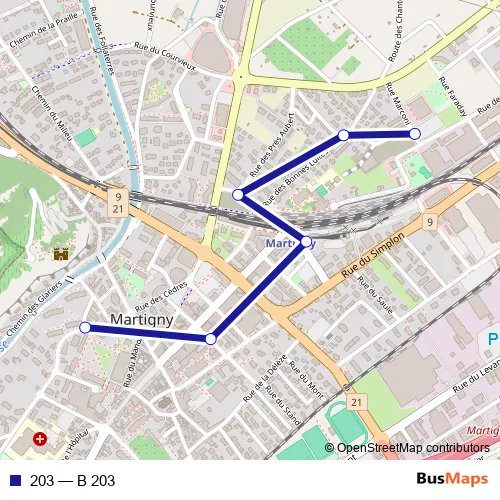 The first stop of the 203 bus route is Martigny, Bassin du Manoir and the last stop is Martigny, Grandes Maresches. 203 (B 203) is operational during an Werktagen.