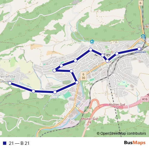 The first stop of the 21 bus route is Perrefitte, poste and the last stop is Moutier, gare. 21 (B 21) is operational during täglich.