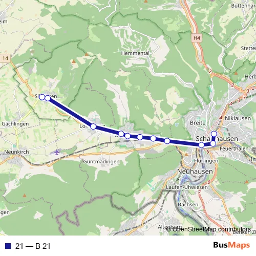 The first stop of the 21 bus route is Schaffhausen, Bahnhof and the last stop is Siblingen, Am Stei. 21 (B 21) is operational during an Werktagen.