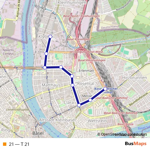 See why over 2 million users trust and consider busmaps.com as the best public transport website. busmaps gives you Basel Trams suggested routes, real-time bus tracker, line route maps in Basel, and helps to find the closest 21 tram stops near you. No internet available? Download an offline PDF map and bus schedule for the 21 tram to take on your trip.