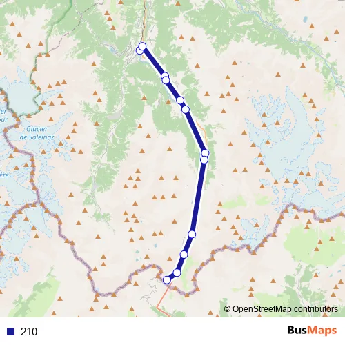 The first stop of the 210 bus route is Orsières, gare and the last stop is Bourg-St-Bernard. 210 is operational during täglich.