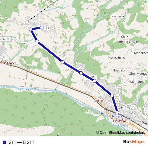 The first stop of the 211 bus route is Fanas, Kirche and the last stop is Schiers, Bahnhof. 211 (B 211) is operational during an Werktagen.