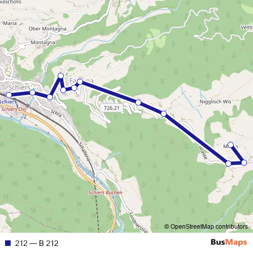 The first stop of the 212 bus route is Schiers, Bahnhof and the last stop is Stels, Mottis. 212 (B 212) is operational during täglich.