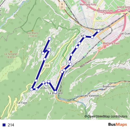The first stop of the 214 bus route is Ravoire, Le Feylet and the last stop is Martigny, gare. 214 is operational during täglich.
