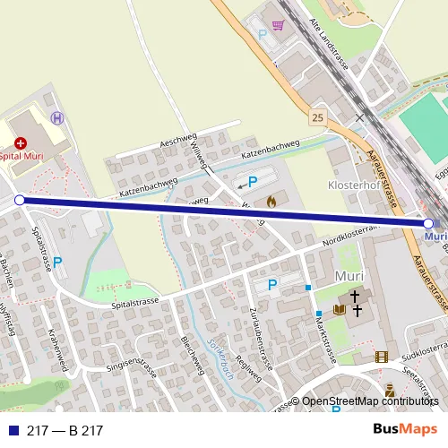 The first stop of the 217 bus route is Muri AG, Bahnhof and the last stop is Muri AG, Spital. 217 (B 217) is operational during am Wochenende.