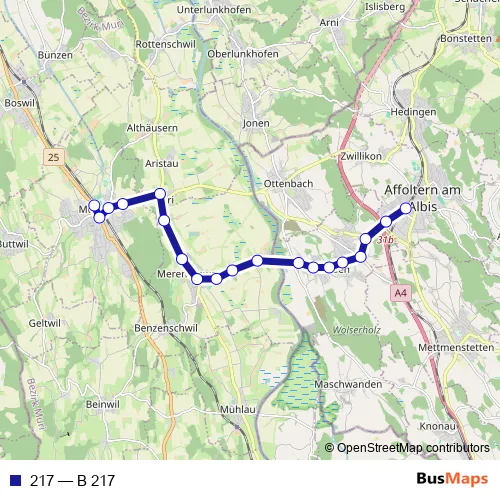 The first stop of the 217 bus route is Muri AG, Bahnhof and the last stop is Affoltern a.A., Bahnhof. 217 (B 217) is operational during täglich.