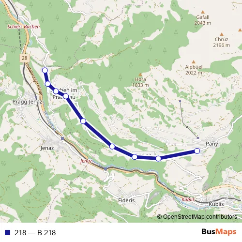 The first stop of the 218 bus route is Pany, Schulhaus and the last stop is Lunden, Hinterlunden. 218 (B 218) is operational during an Werktagen.