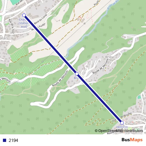 The first stop of the 2194 cable-car route is Chalais (station aval) and the last stop is Vercorin (station amont). 2194 is operational during täglich.