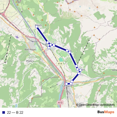 The first stop of the 22 bus route is Fläsch, Dorf and the last stop is Landquart, Bahnhof. 22 (B 22) is operational during täglich.