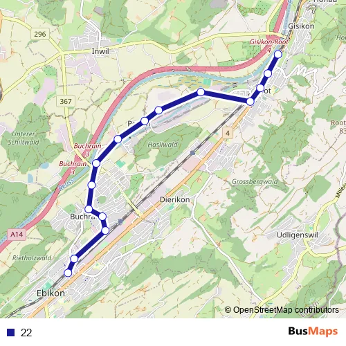 The first stop of the 22 bus route is Ebikon, Bahnhof and the last stop is Gisikon-Root, Bahnhof. 22 is operational during täglich.