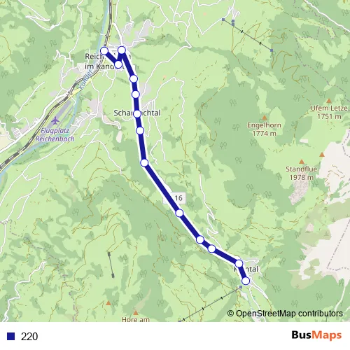 The first stop of the 220 bus route is Reichenbach i. K., Bahnhof and the last stop is Kiental, Ramslauenen. 220 is operational during täglich.
