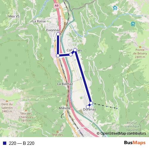 The first stop of the 220 bus route is Dorénaz, école and the last stop is Evionnaz, grande salle. 220 (B 220) is operational during an Werktagen.