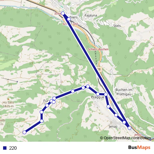The first stop of the 220 bus route is Furna, Hinterberg and the last stop is Schiers, Bahnhof. 220 is operational during täglich.