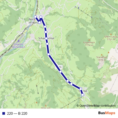The first stop of the 220 bus route is Kiental, Ramslauenen and the last stop is Reichenbach i. K., Bahnhof. 220 (B 220) is operational during täglich.