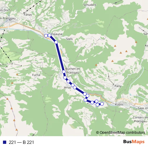 The first stop of the 221 bus route is Schiers, Bahnhof and the last stop is Fideris, Strahlegg. 221 (B 221) is operational during an Werktagen.