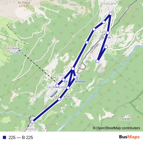 The first stop of the 225 bus route is Les Marécottes, télécabine and the last stop is Salvan, Le Carre. 225 (B 225) is operational during täglich.
