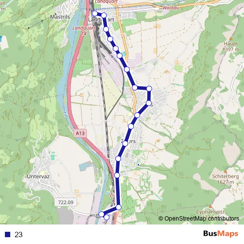 The first stop of the 23 bus route is Untervaz, Bahnhof and the last stop is Landquart, Bahnhof. 23 is operational during täglich.