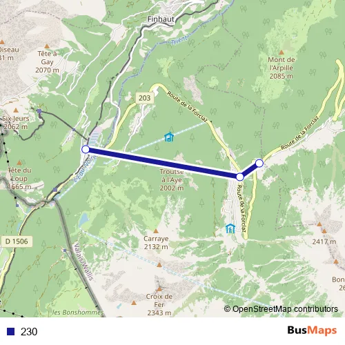 The first stop of the 230 bus route is Col-de-la-Forclaz and the last stop is Le Châtelard VS, gare. 230 is operational during täglich.