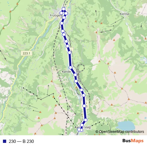 The first stop of the 230 bus route is Frutigen, Bahnhof and the last stop is Kandersteg, Bahnhof. 230 (B 230) is operational during täglich.