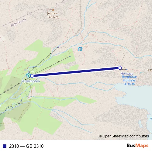 The first stop of the 2310 cable-car route is Kreuzboden and the last stop is Hohsaas. 2310 (GB 2310) is operational during täglich.