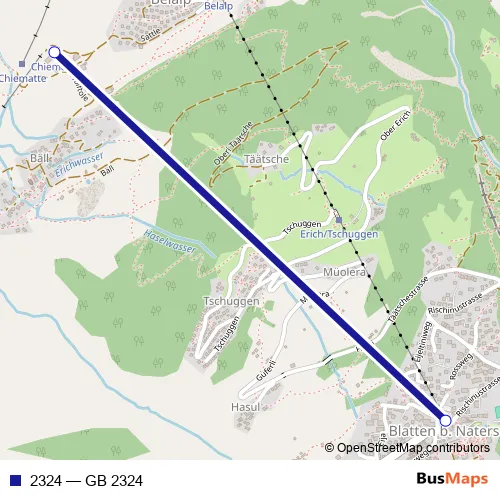 The first stop of the 2324 cable-car route is Belalp Chiematte and the last stop is Blatten b. Naters (Belalpbahn). 2324 (GB 2324) is operational during täglich.