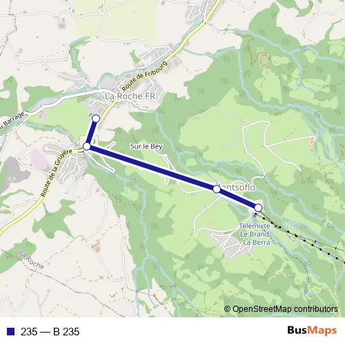 The first stop of the 235 bus route is La Roche FR, école and the last stop is La Roche FR, La Berra. 235 (B 235) is operational during am Wochenende.