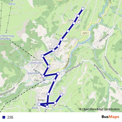 The first stop of the 235 bus route is Adelboden, Ausserschwand and the last stop is Adelboden, Hotel Alpina. 235 is operational during täglich.