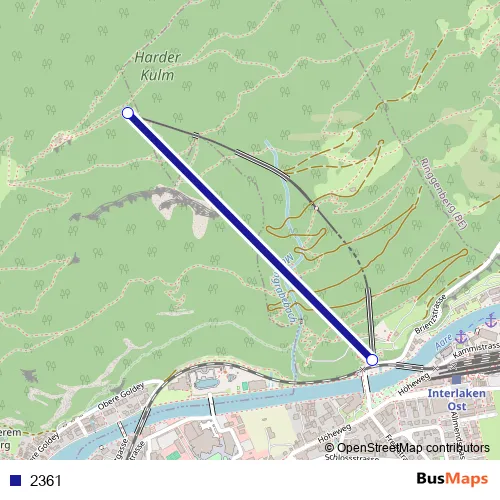 The first stop of the 2361 funicular route is Harder Kulm and the last stop is Interlaken Harderbahn. 2361 is operational during täglich.