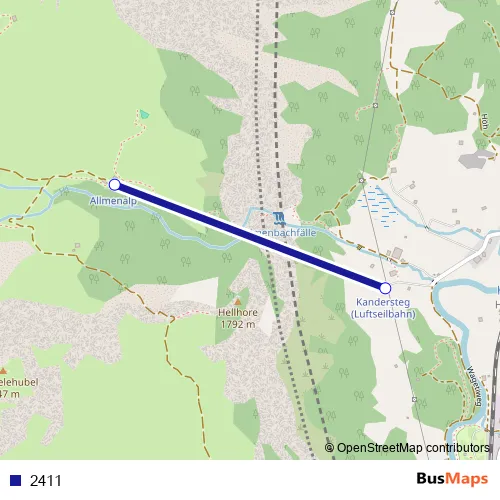 The first stop of the 2411 cable-car route is Kandersteg (Luftseilbahn) and the last stop is Allmenalp. 2411 is operational during täglich.