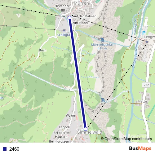The first stop of the 2460 cable-car route is Gimmelwald (Schilthornbahn) and the last stop is Mürren (Schilthornbahn). 2460 is operational during täglich.