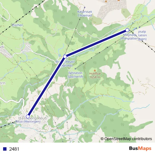 The first stop of the 2481 cable-car route is Hasliberg Reuti (Gondelbahn) and the last stop is Mägisalp. 2481 is operational during täglich.