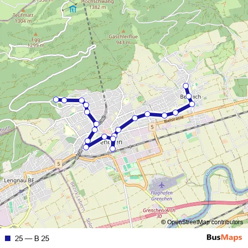 See why over 2 million users trust and consider busmaps.com as the best public transport website. busmaps gives you Grenchen Buses suggested routes, real-time bus tracker, line route maps in Grenchen, and helps to find the closest 25 bus stops near you. No internet available? Download an offline PDF map and bus schedule for the 25 bus to take on your trip.