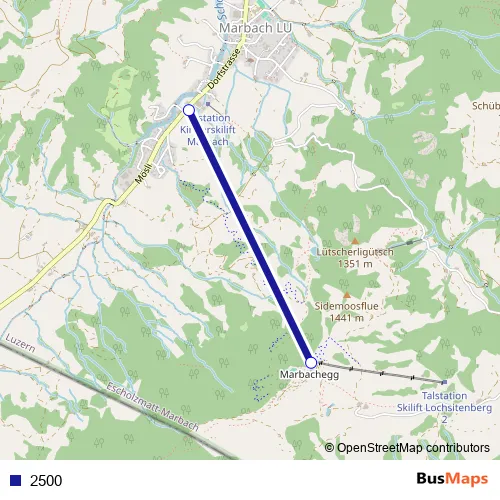The first stop of the 2500 cable-car route is Marbachegg and the last stop is Marbach (Talstation). 2500 is operational during täglich.