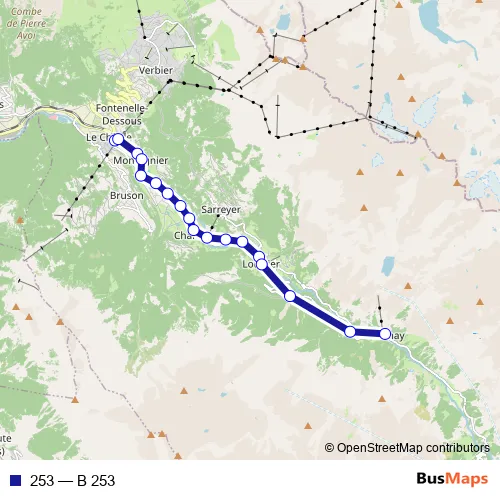 The first stop of the 253 bus route is Le Châble VS, gare and the last stop is Fionnay. 253 (B 253) is operational during täglich.