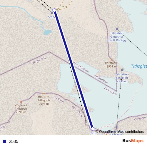 The first stop of the 2535 cable-car route is Titlis and the last stop is Stand. 2535 is operational during täglich.