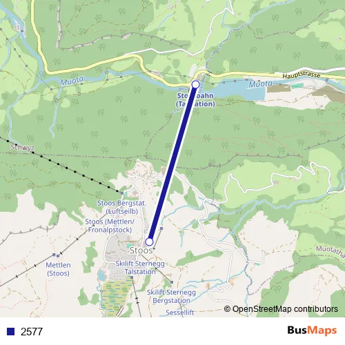 The first stop of the 2577 funicular route is Schwyz Stoosbahn (Talstation) and the last stop is Stoos Sz. 2577 is operational during täglich.