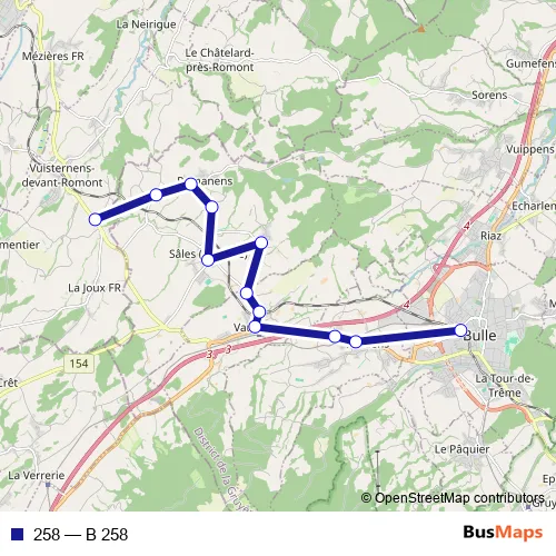 The first stop of the 258 bus route is Bulle, gare routière and the last stop is Vuisternens-dt-Romont, forge. 258 (B 258) is operational during täglich.
