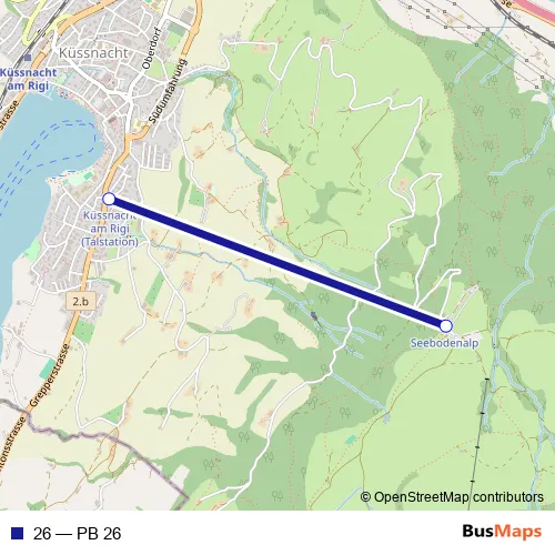 The first stop of the 26 cable-car route is Seebodenalp and the last stop is Küssnacht am Rigi (Talstation). 26 (PB 26) is operational during am Wochenende.