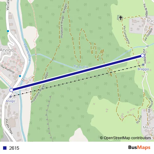 The first stop of the 2615 cable-car route is Arvigo (Funivia) and the last stop is Braggio. 2615 is operational during täglich.