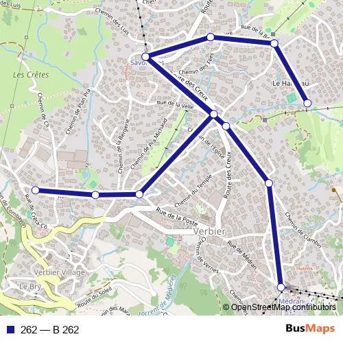 The first stop of the 262 bus route is Verbier, Médran and the last stop is Verbier, Crettaz Cô. 262 (B 262) is operational during täglich.