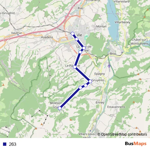 The first stop of the 263 bus route is Bulle, gare routière and the last stop is Moléson-sur-Gruyères. 263 is operational during täglich.