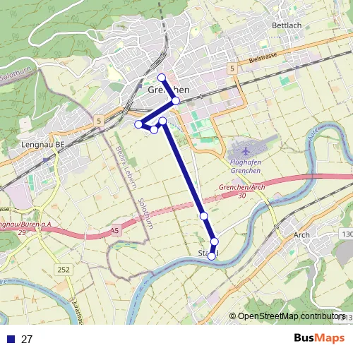 The first stop of the 27 bus route is Staad (Grenchen), Käserei and the last stop is Grenchen, Postplatz. 27 is operational during an Werktagen.