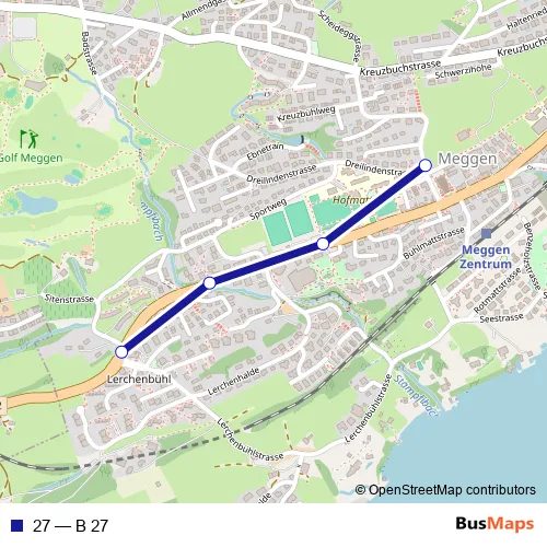 The first stop of the 27 bus route is Meggen, Piuskirche and the last stop is Meggen, Lerchenbühl. 27 (B 27) is operational during am Wochenende.