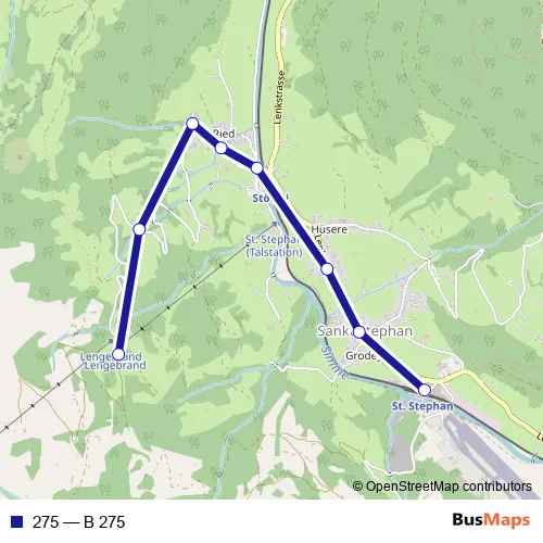 The first stop of the 275 bus route is St. Stephan, Bahnhof and the last stop is St. Stephan, Lengebrand. 275 (B 275) is operational during am Wochenende.