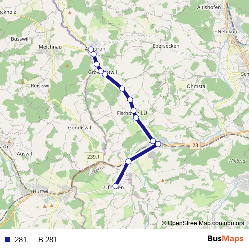 The first stop of the 281 bus route is Ufhusen, Käserei Dorf and the last stop is Altbüron, Post. 281 (B 281) is operational during an Werktagen.