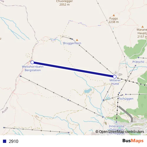 The first stop of the 2910 cable-car route is Weisshorn and the last stop is Arosa (Mittelstation)Weisshorn. 2910 is operational during täglich.