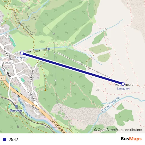 The first stop of the 2982 cable-car route is Pontresina (Sesselb. Languard) and the last stop is Alp Languard. 2982 is operational during täglich.