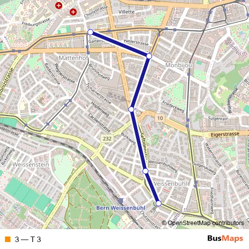 The first stop of the 3 tram route is Bern, Weissenbühl (Tram) and the last stop is Bern, Kaufmännischer Verband. 3 (T 3) is operational during täglich.