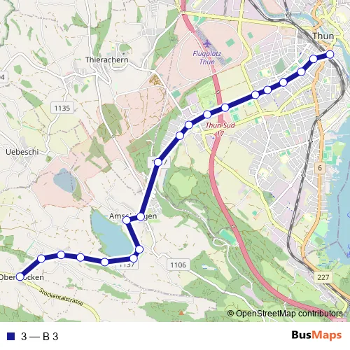 The first stop of the 3 bus route is Oberstocken, Kreuzgasse and the last stop is Thun, Bahnhof. 3 (B 3) is operational during täglich.