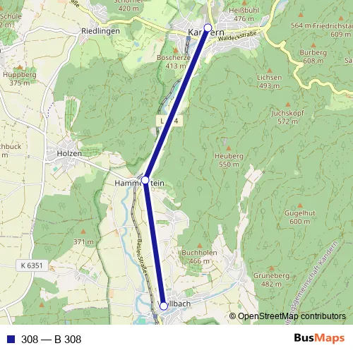 The first stop of the 308 bus route is Kandern, alte Schule and the last stop is Wollbach (Kr LÖ), Schule. 308 (B 308) is operational during täglich.